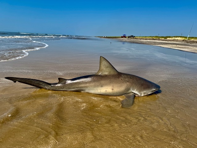 A bull shark (Carcharhinus leucas), five to six feet long. Clean hook. Brutal pull. Perfect release.