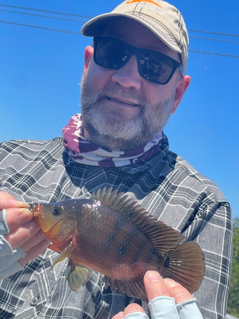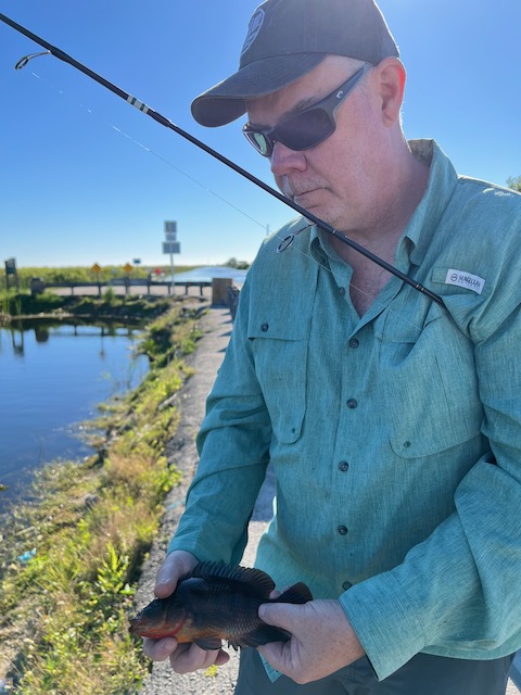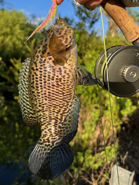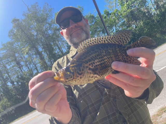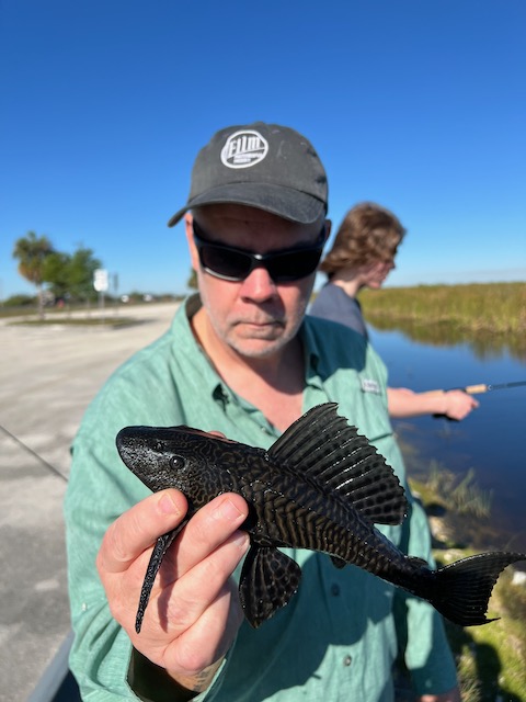 The morning bite was quiet. We picked off a few Mayan cichlids, and Dave and Bret each pulled a spotted sunfish (Lepomis punctatus), with Bret getting his on a fly rod just to flex. And then—because Florida is allergic to predictability—Bret somehow landed a pleco (Pterygoplichthys sp.) on a jig. A full-blown armored catfish. Not snagged. A legit eat. The kind of thing you might tell someone at a bar, and they’d slowly back away from you.