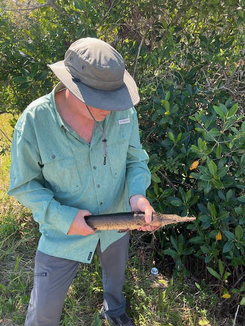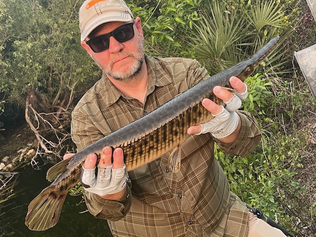 Dave stuck a lump of a Florida gar—legit size, legit eat.