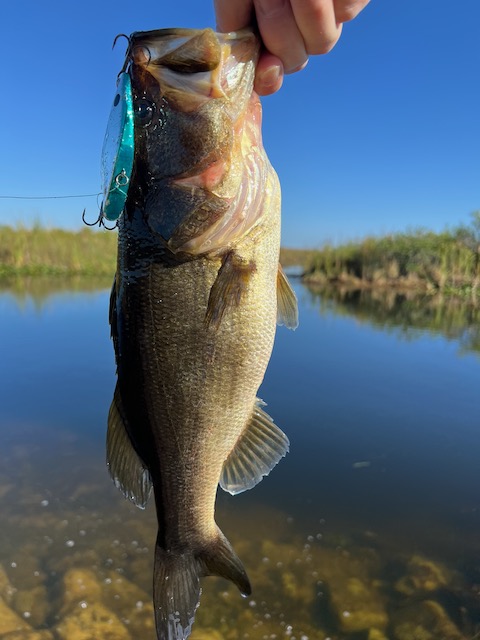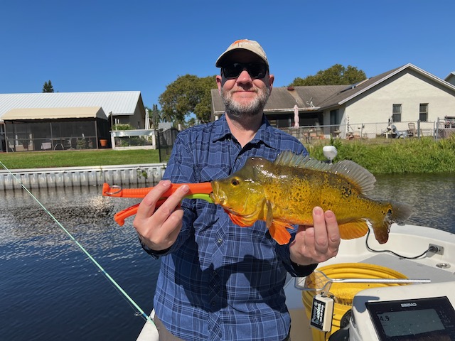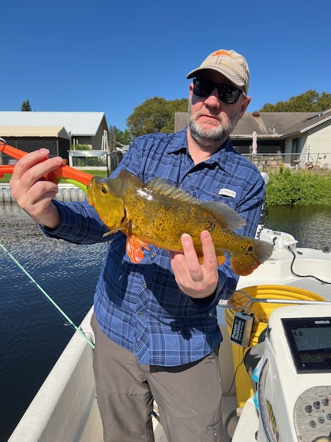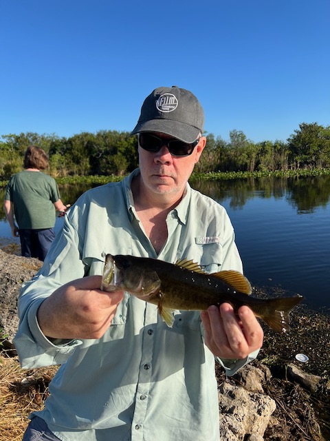 Dave struck first with a pair of peacock bass and a surprise hybrid striped bass (Morone saxatilis × chrysops). Both Bret and Dave added more Florida bass to the running tally.