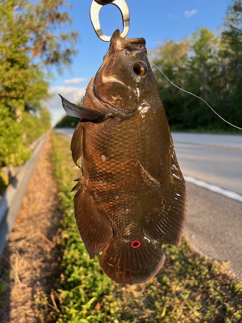 Bret landed a couple more Florida gar (Lepisosteus platyrhincus) that morning, while Mayan cichlidsOscars, and Jaguar cichlids stacked up further down the Trail as the ditch narrowed to little more than a soggy gutter. Didn’t matter. The fish were there.